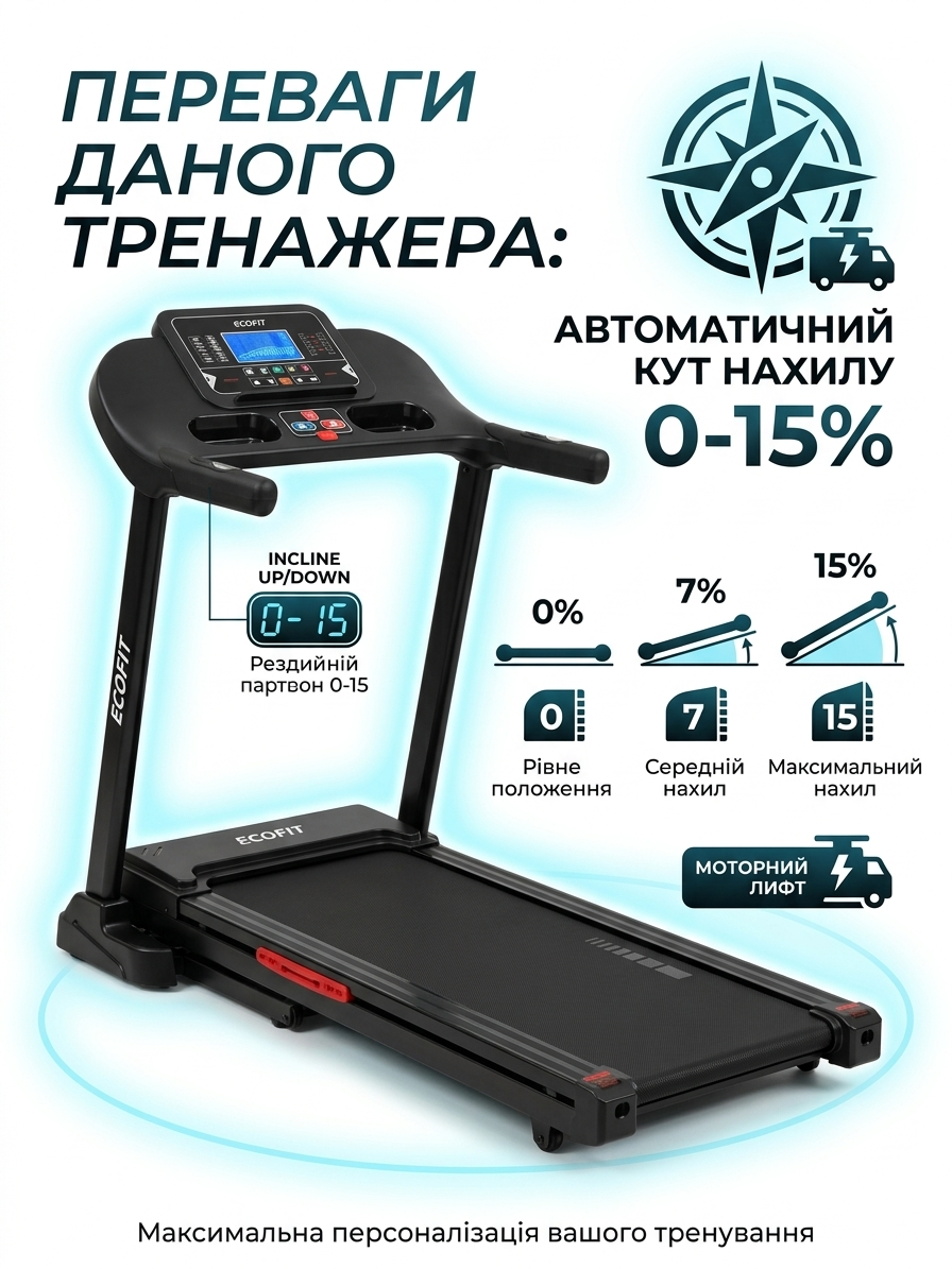 🏔️ Ефект гірського рельєфу: Електричне регулювання кута нахилу до 15° дозволяє імітувати підйоми, спалюючи вдвічі більше калорій та інтенсивно прокачуючи м'язи ніг.