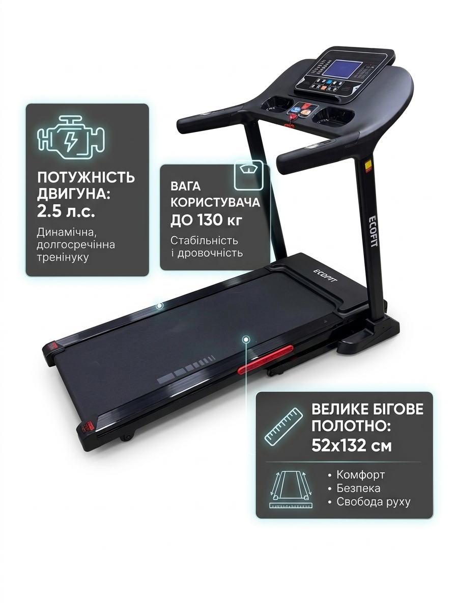 Бігова доріжка такої потужності — це інвестиція у ваше здоров’я на роки вперед. Не чекайте нагоди, створюйте її самі разом з EcoFit E-T296!