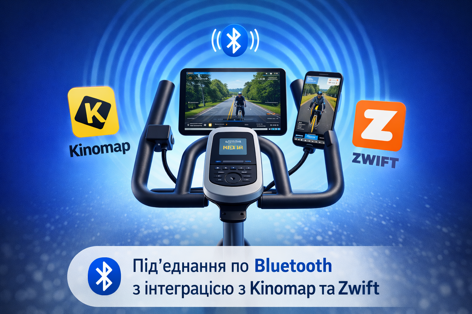 Bluetooth-підключення до пристроїв Android і iOS через додаток FitShow — зручний контроль тренувань зі смартфона, виведення даних на екран, запис результатів і персональні плани. Доступ за допомогою QR-коду.