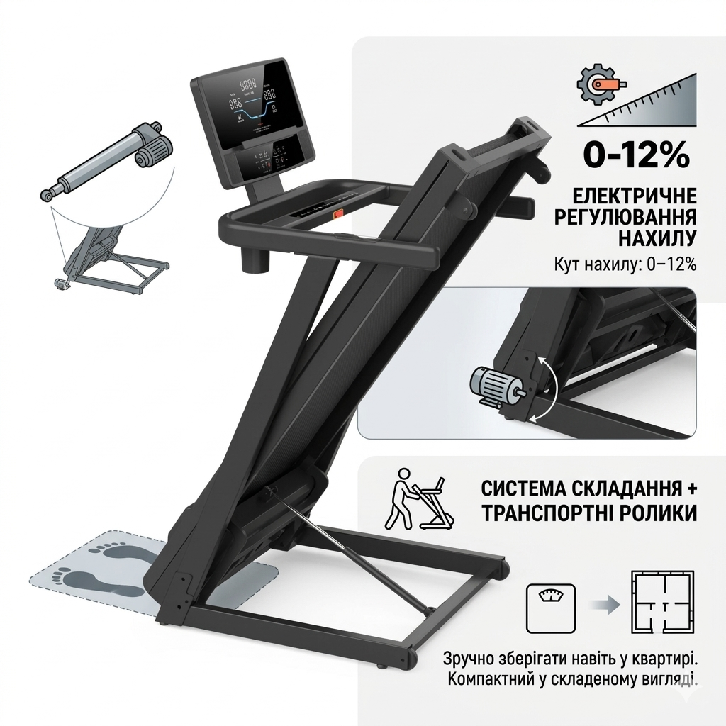 ⛰️ 12 рівнів нахилу полотна – створюють ефект бігу на підйом та підвищують ефективність тренування.