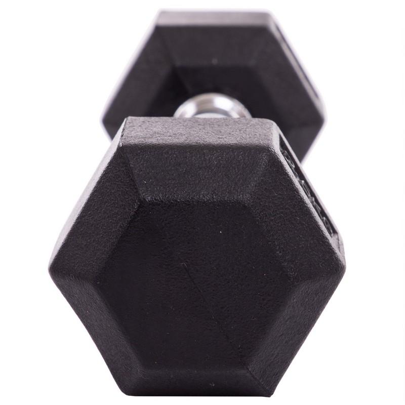 - Шестигранна форма з гумовим покриттям: Саме через свою шестигранну форму гантель не кочується під час вправ, а гумове покриття забезпечує додатковий захист для підлоги від подряпин і пошкоджень.