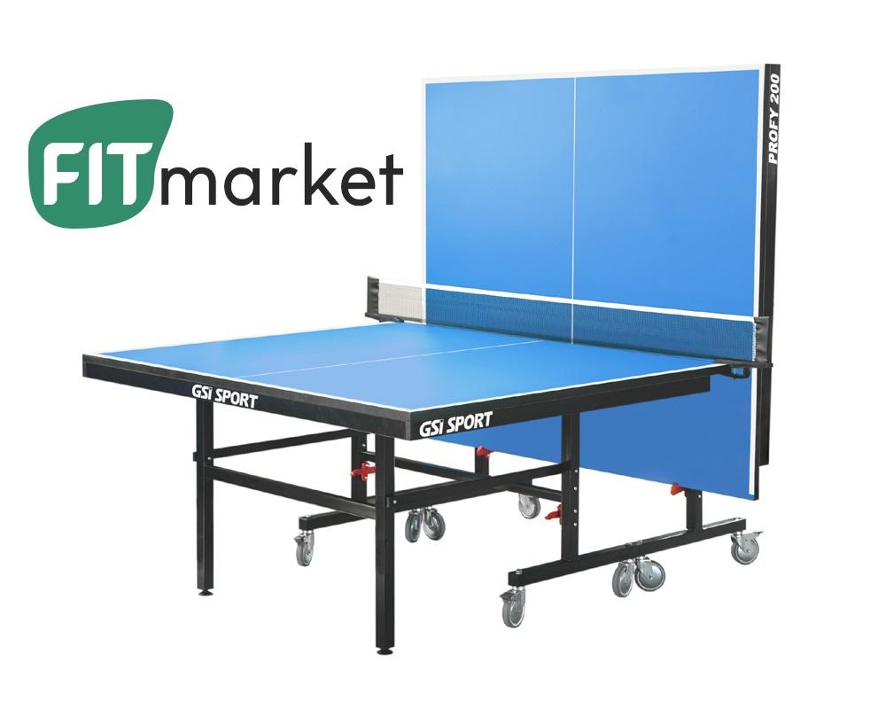 Стіл для настільного тенісу Profy 200 виконаний відповідно до міжнародних стандартів та призначений для гри в закритих приміщеннях. Як матеріал для ігрової поверхні використовується спеціально оброблена деревостружкова плита (ДСП) товщиною 22 мм, посилена металевим профілем 50*20 мм. На ДСП нанесене спеціальне покриття антивідблиску пластикове покриття синього кольору, що забезпечує ідеально правильний відскок м'яча. Кожна з двох ігрових поверхонь базується на індивідуальному візку, що забезпечує оптимальне розподілення навантаження на основу тенісного столу, а також спрощує його транспортування. Візки виготовлені із металевого профілю 40*40 мм з поліефірним покриттям. Кожен візок має 4 обгумовані колеса діаметром 100 мм, два з яких забезпечені гальмівним механізмом, що дозволяє уникати випадкових рухів тенісного столу в процесі його експлуатації та зберігання. Зовнішні опорні ноги мають регулювальний механізм висоти, що дозволяє коригувати нерівності підлоги в межах до +15 мм.