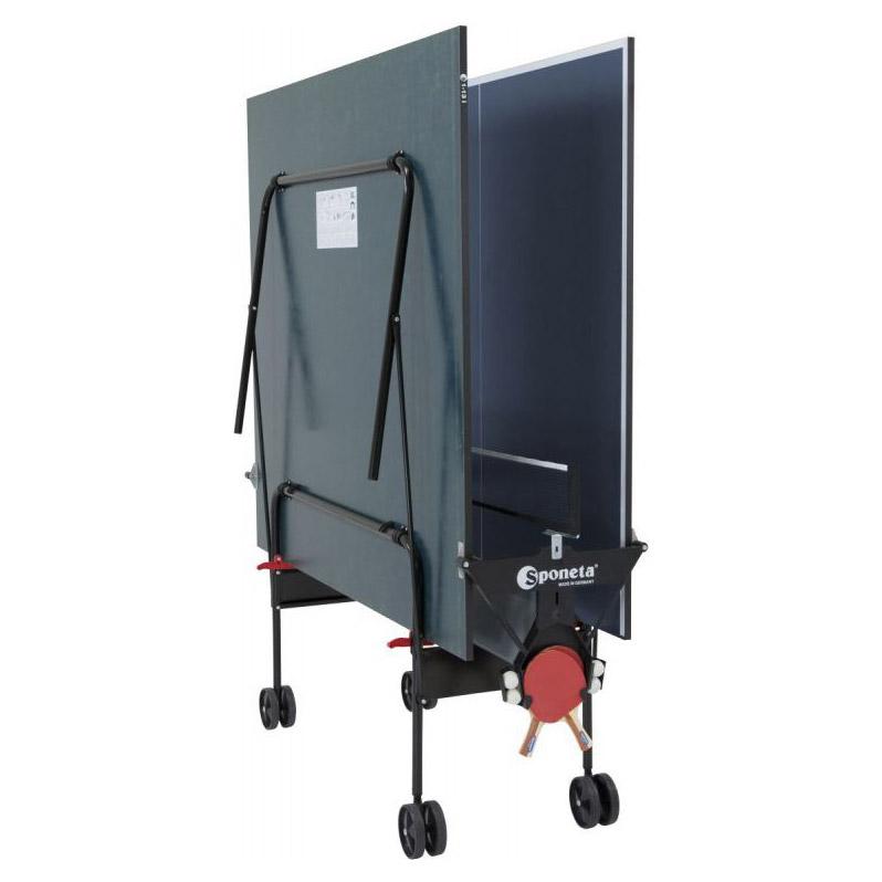 Стіл тенісний Sponeta S1-13i - чудовий складний тенісний стіл для гри в закритих приміщеннях. Кожен, хто грав у настільний теніс, ніколи не забуде захопливості та азарту цієї гри. А скільки радості, бадьорості та позитивних емоцій приносить цей простий та доступний вид прикладної гри. Як матеріал для столу використовується спеціально оброблена деревостружкова плита (ДСП) товщиною 19 мм, що забезпечує дуже хороший відскок м'яча під час гри. На ДСП нанесене спеціальне покриття антивідблиску. Стіл легко переміщається на 4-х колесах діаметром 125 мм, два колеса – маневрені. Конструкція столу дозволяє тренуватися поодинці.