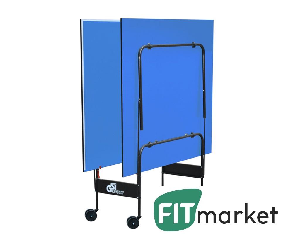 Тенісний стіл для закритих приміщень. Як матеріал для ігрової поверхні використовується спеціально оброблена деревостружкова плита (ДСП) товщиною 16 мм. На ДСП нанесене спеціальне покриття антивідблиску пластикове покриття синього кольору. Тенісний стіл базується на зручному візку, виготовленому з металевого трубчастого профілю діаметром 25 мм з поліефірним покриттям. Конструкція столу дозволяє тренуватися поодинці. Стіл легко переміщається на 4-х здвоєних колесах діаметром 107 мм, 2 маневрені колеса.