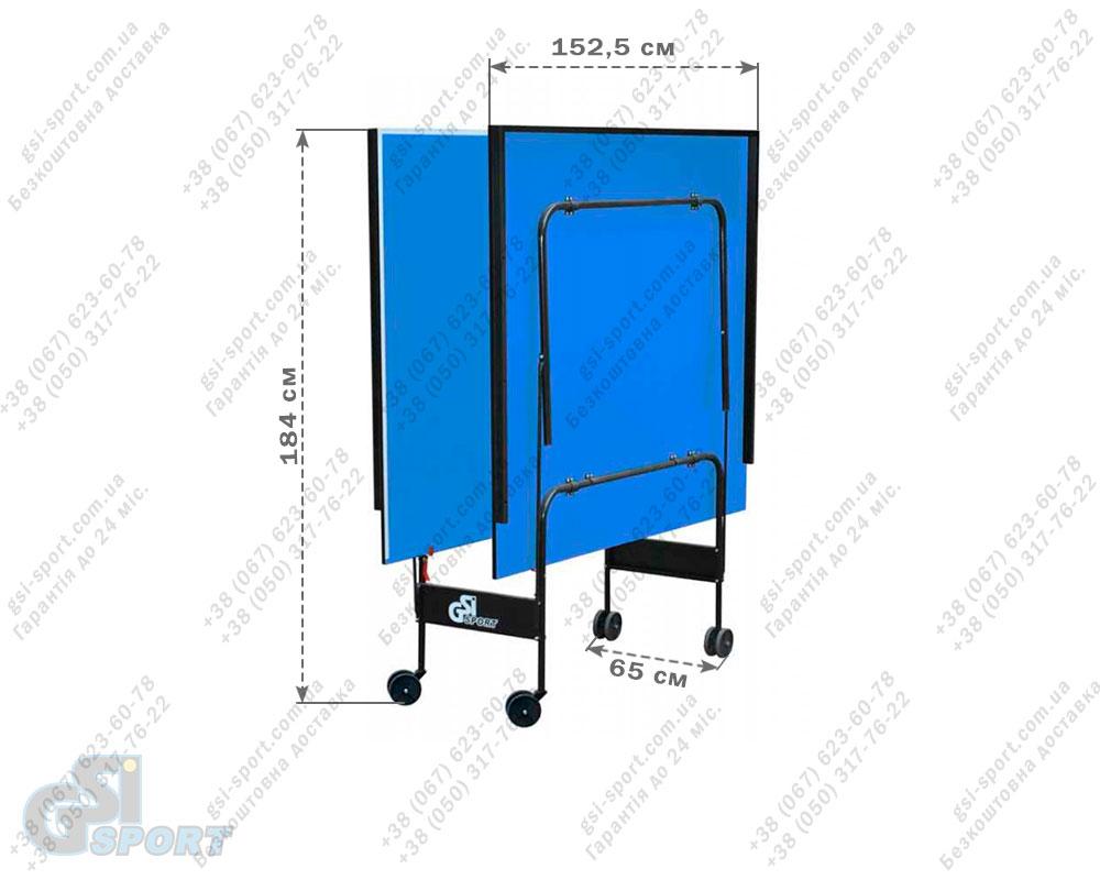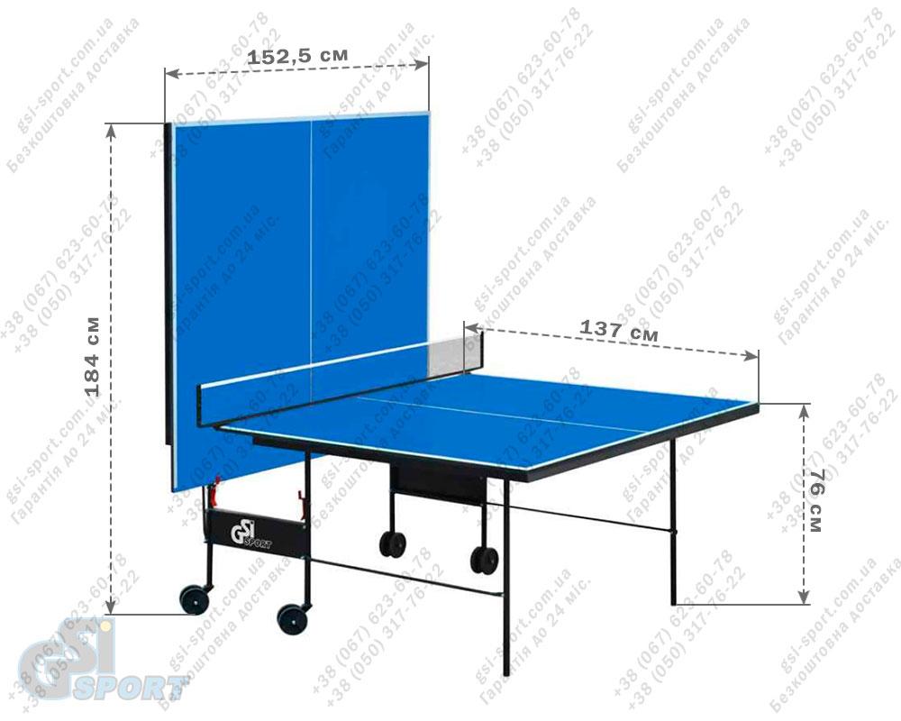 Розміри тенісного столу у розкладеному положенні складають довжину 274 см, ширину 152,5 см і висоту 76 см, у складеному - довжину 65 см, ширину 152,5 см і висоту 184 см. Вага столу - 65 кг.