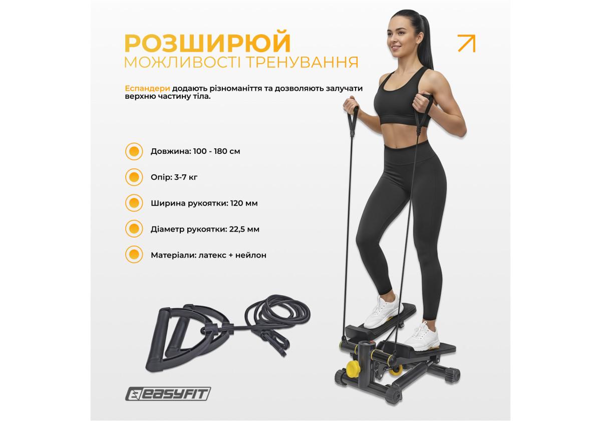 Еспандери логічно доповнюють тренування: тяга на 100–180 см під’єднує плечовий пояс і руки, допомагаючи рівномірно розподіляти навантаження по всьому тілу. У використанні EasyFit Pace-A відчувається стійко: сталева рама не люфтить, педалі рухаються рівно, а корпус зберігає жорсткість навіть під час частих змін темпу.
