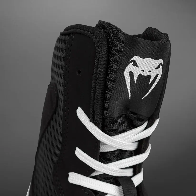 ✨ Класичне чорно-біле оформлення та фірмові логотипи Venum на язичку і п’яті роблять модель універсальною та стильною. Боксерки чудово поєднуються з рукавичками з лінійок Venum Elite або Venum Contender 2.0.
