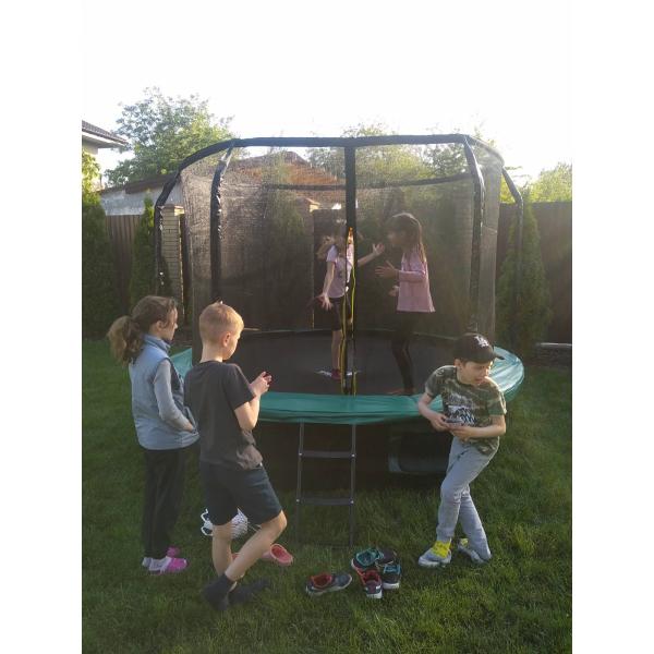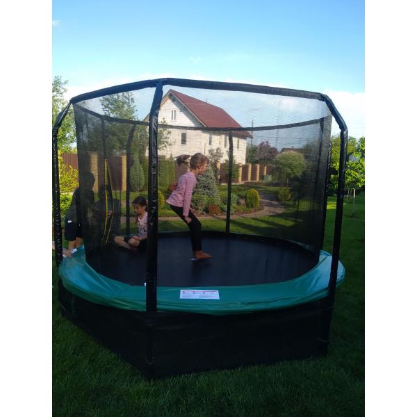 Комплексний захист: Міцне стрибкове полотно Permatron, багатошаровий захисний мат, UV-захищена лавсанова сітка та нижня захисна сітка підвищують безпеку використання батута.
