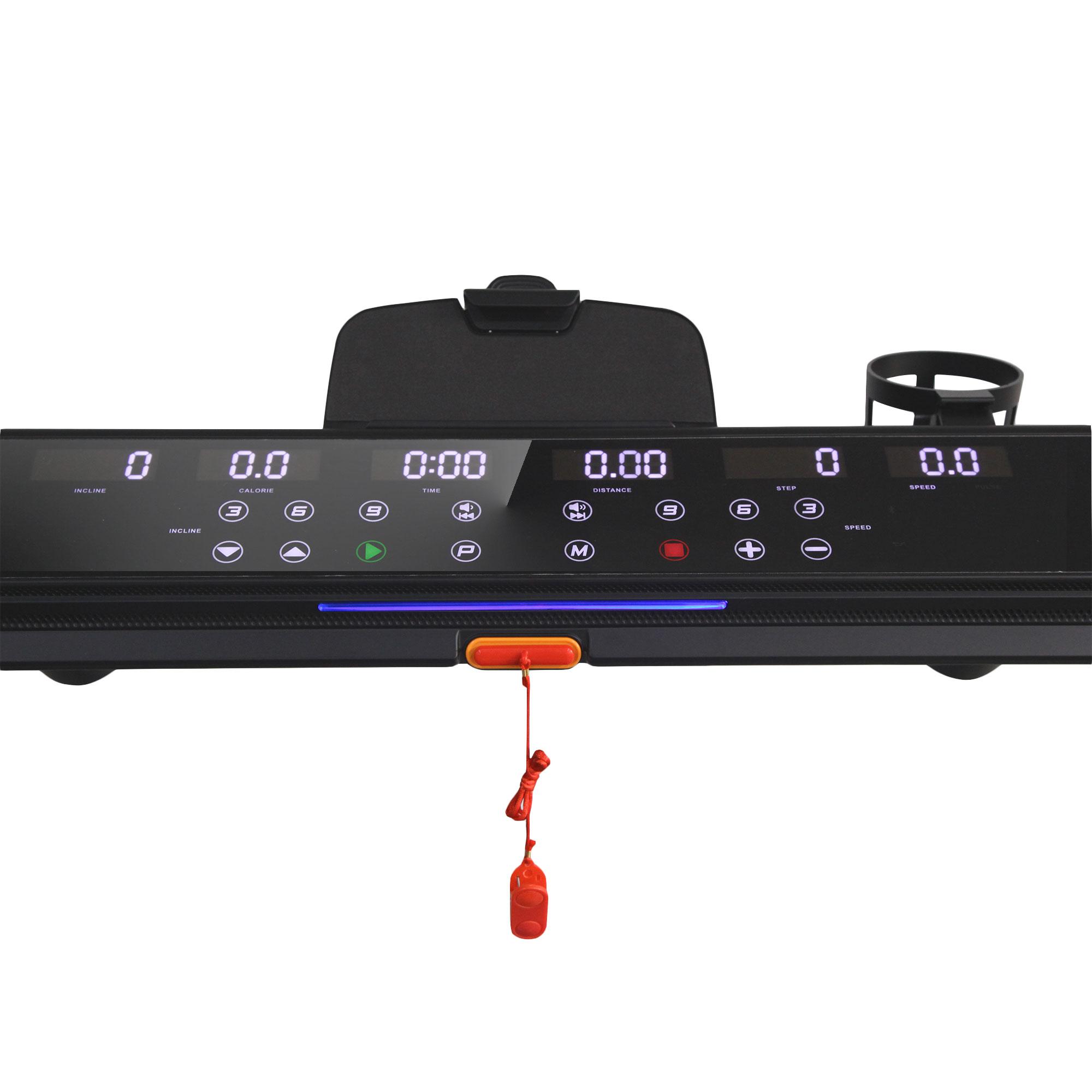 Зручна консоль з шістьма вікнами відображає основні параметри тренування: швидкість, нахил, час, дистанцію, калорії, кроки та пульс.