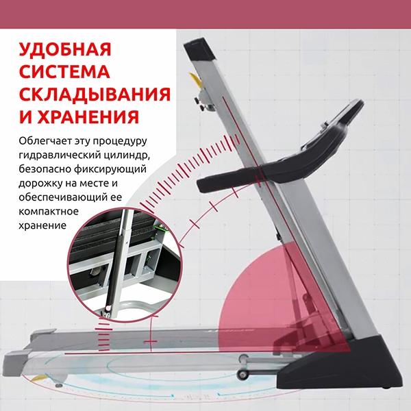 - для високого комфорту і безпеки встановлений гідравлічний циліндр, що полегшує процедуру складання/розкладання доріжки. Надежная система складання забезпечує компактне зберігання і можливість швидкого переміщення не нахиляючи важкий тренажер, завдяки чотирьом опорним роликам на відміну від двох, як це зазвичай У інших виробників;