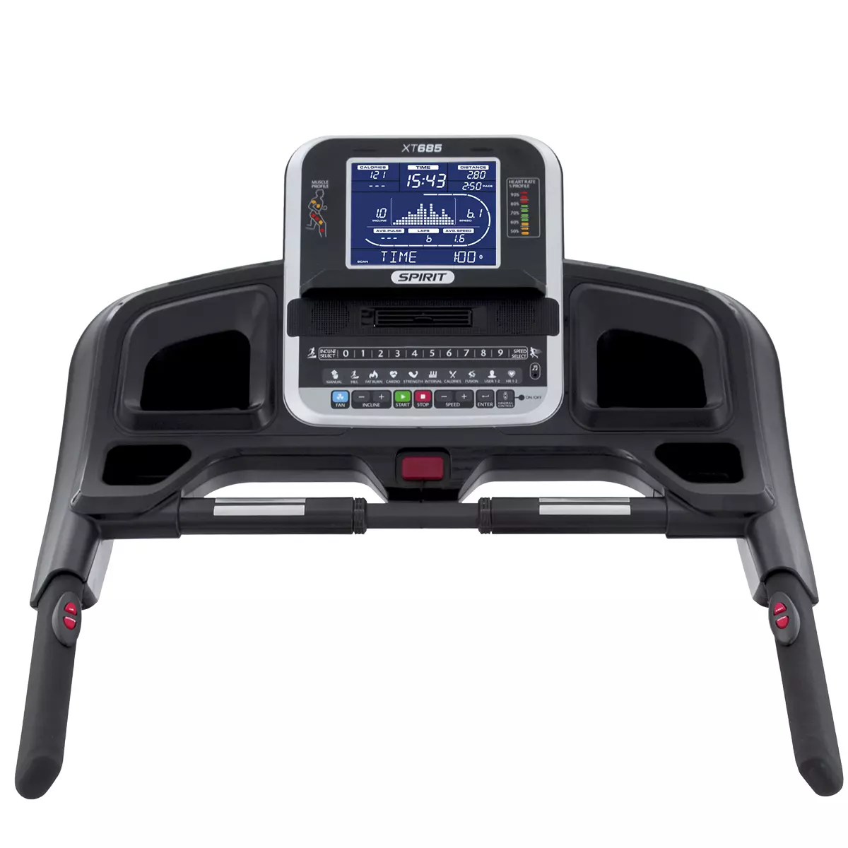 Висока якість матеріалів і збірки, великий вал для стабільного зчеплення, надійні підшипники комерційного рівня, широкі приводні ремені, великий рідкокристалічний дисплей з блакитний підсвічуванням, дистанційне вимірювання пульсу і поставка в комплекті з біговою доріжкою нагрудного кардіодатчику, потужний двигун і просторе багатошарове бігове полотно, добре налаштована амортизація, продумане програмне забезпечення, тільки самі корисні функції і чудовий естетичний вигляд радує око, тривалий термін гарантії - основні переваги бігової доріжки SPIRIT Esprit XT-685.16