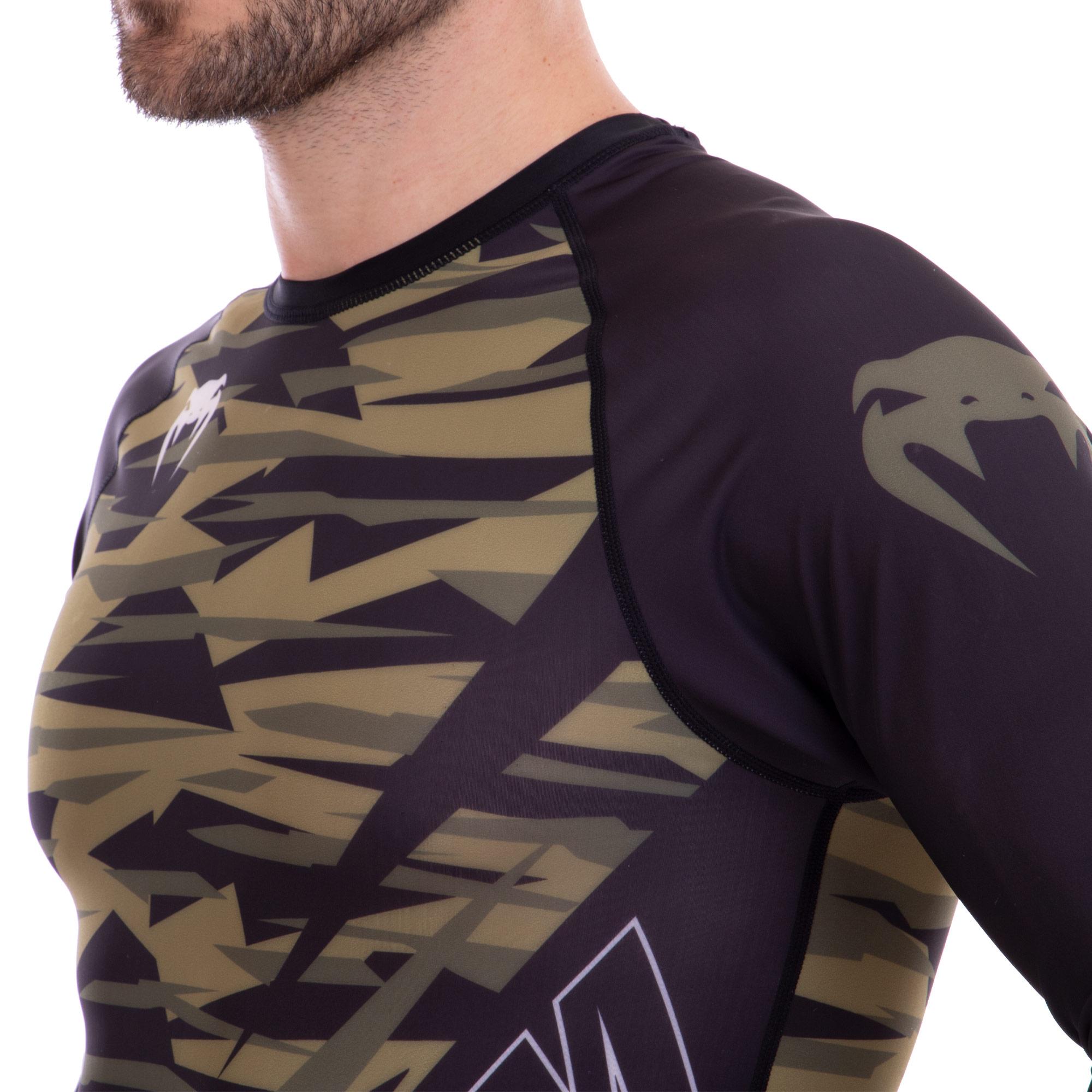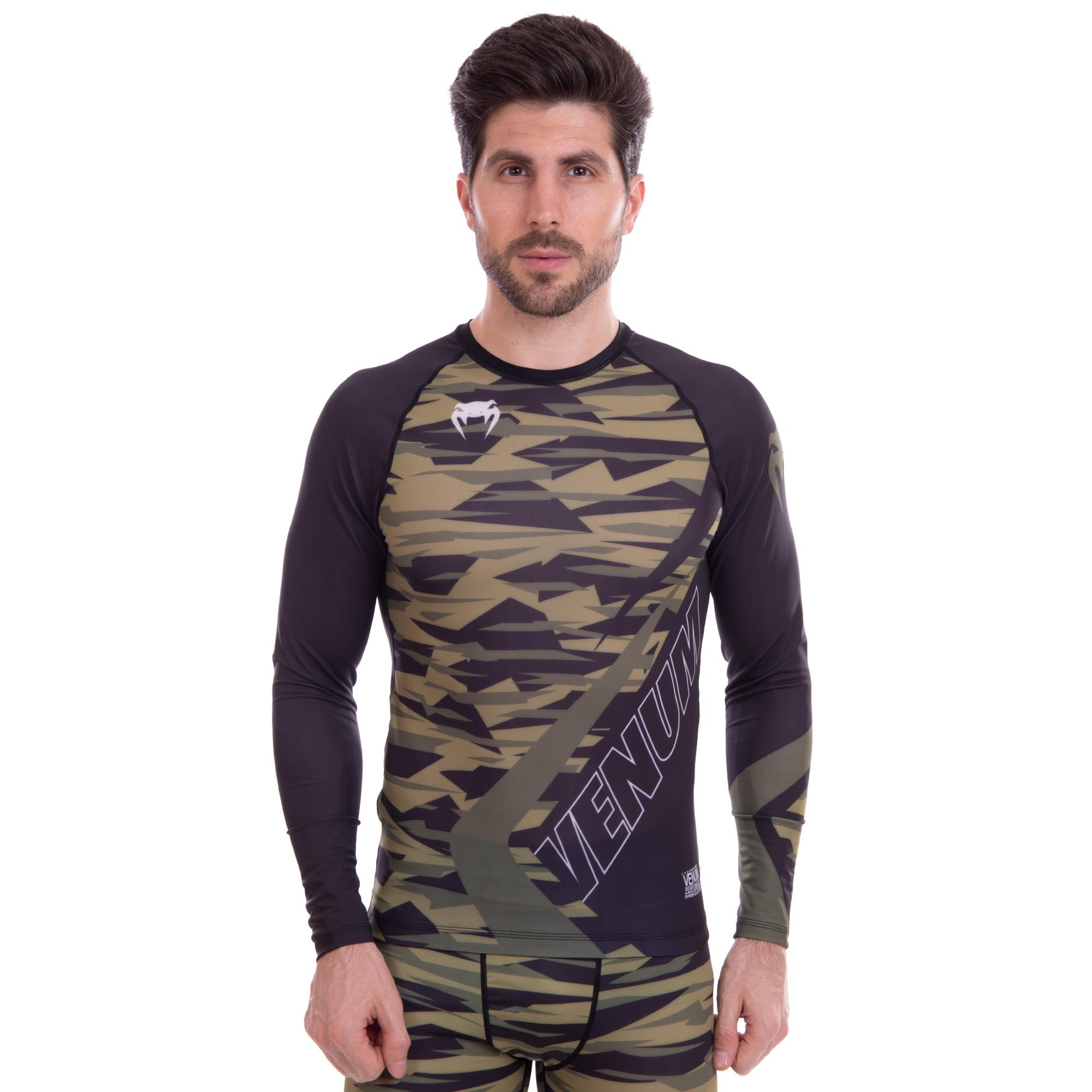 Рашгард є компресійною футболкою із закритою горловиною і довгими рукавами. У пошитті даного тренувального одягу використані еластан та поліестер. Перша тканина відрізняється підвищеним рівнем еластичності, легкістю. Для поліестеру характерна міцність, зносостійкість, стійкість до деформацій. Поєднання цих матеріалів забезпечує чудові експлуатаційні характеристики виробу. Рашгард щільно облягає тіло бійця, завдяки чому вдається протягом тривалого часу зберігати тепло. Крім того, таке екіпірування легко пропускає повітря і швидко висихає. На відміну від звичайних футболок із бавовни рашгард венум майже не рветься, тому підходить для щоденних активних тренувань зі змішаних єдиноборств та інших видів спорту. Рашгард дуже легкий і майже не відчувається на тілі.
