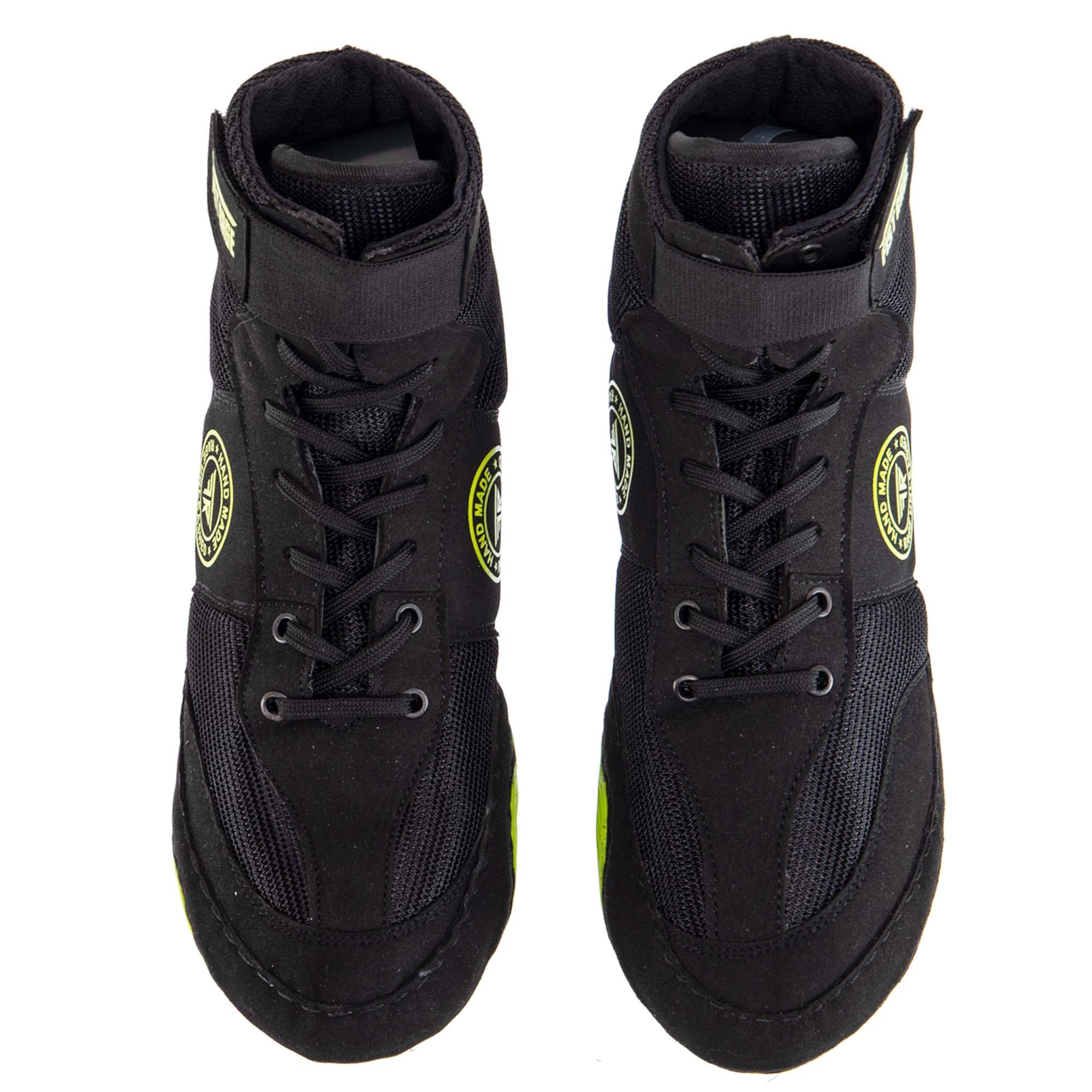 Неслизька гума, з якої виготовлена підошва, надає борцю стійкості на рингу. Центральна частина взуття, включаючи язичок, виконана з пористої синтетики, яка чудово пропускає повітря та відводить піт. Решту «верху» пошитий із замші, тому взуття довго носиться, не втрачаючи своїх якостей. Міцність посадки забезпечує шнурування.